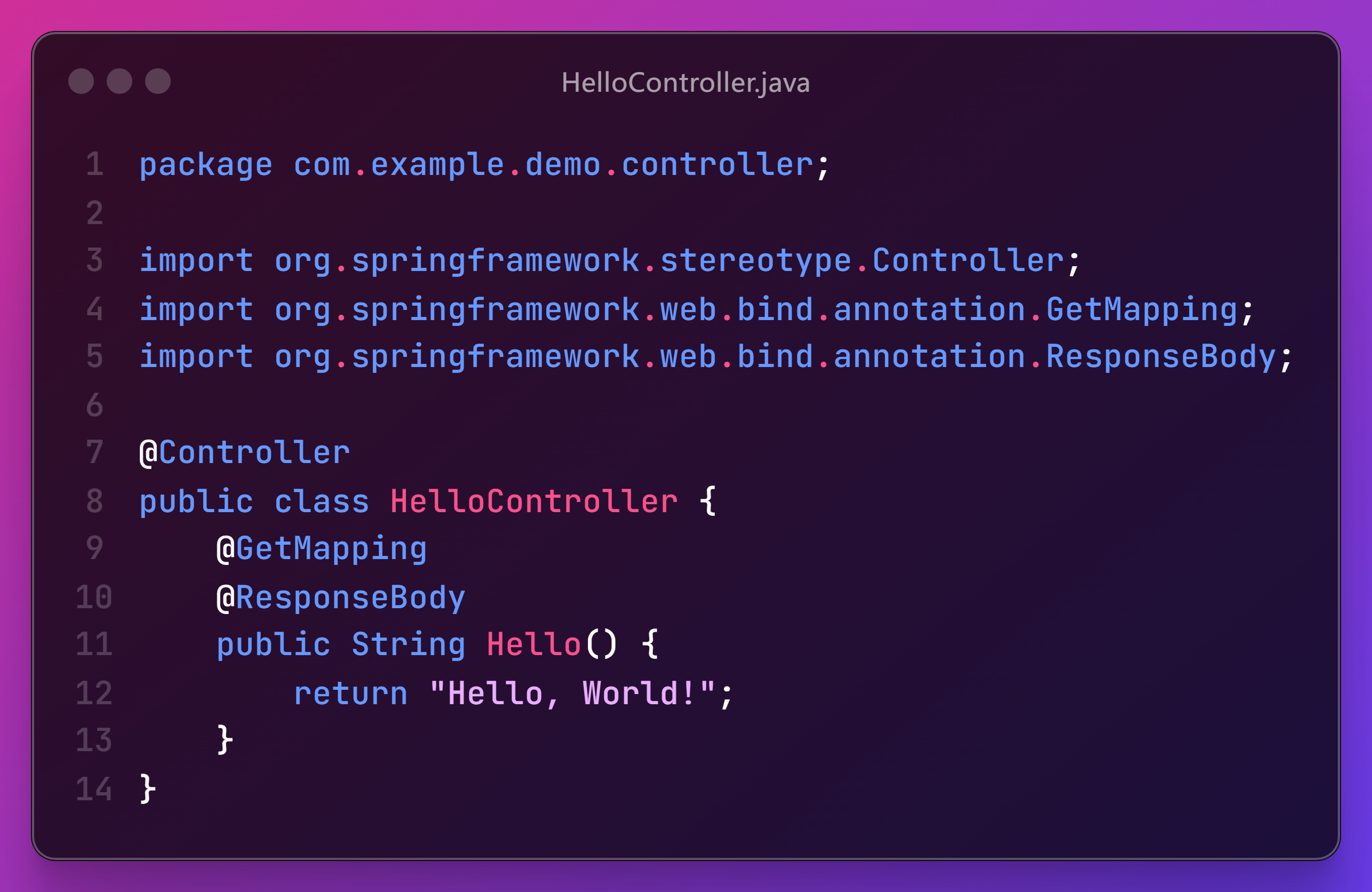 @Controllerpublic class HelloController { @GetMapping @ResponseBody public String Hello() { return "Hello, World!"; }}