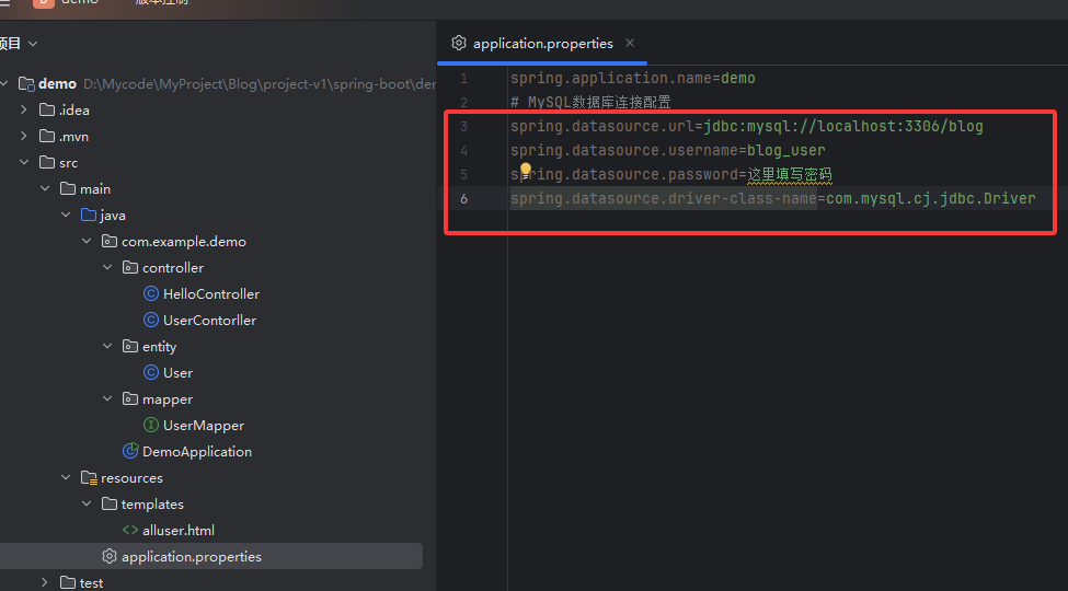 # MySQL数据库连接配置spring.datasource.url=jdbc:mysql://localhost:3306/blogspring.datasource.username=blog_userspring.datasource.password=这里填写密码spring.datasource.driver-class-name=com.mysql.cj.jdbc.Driver