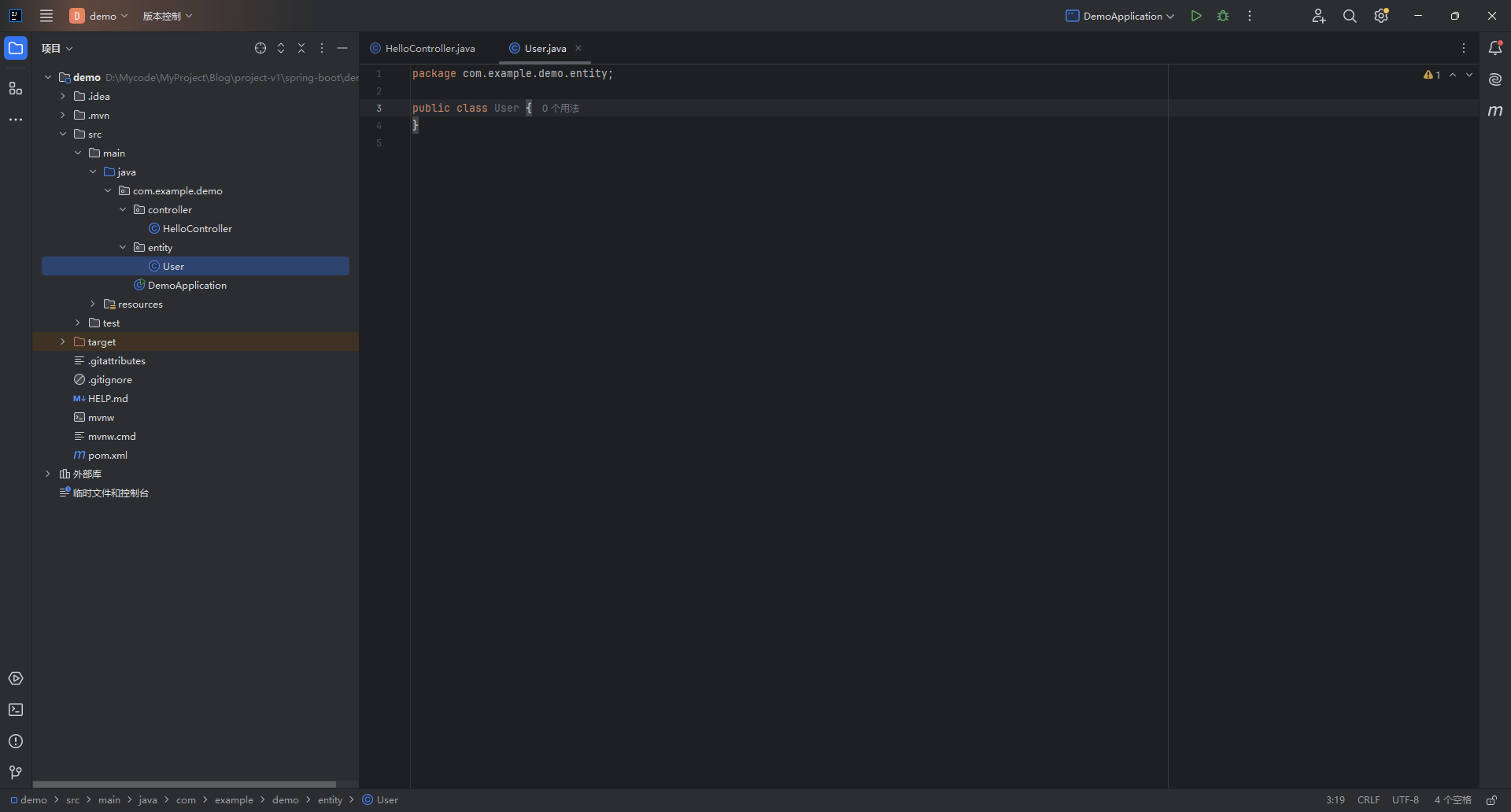 新建软件包entity,并创建一个User类,其中User类和user表同名,可以不区分大小写,因为类名命名规则通常都是首字母大写的驼峰命名法则。