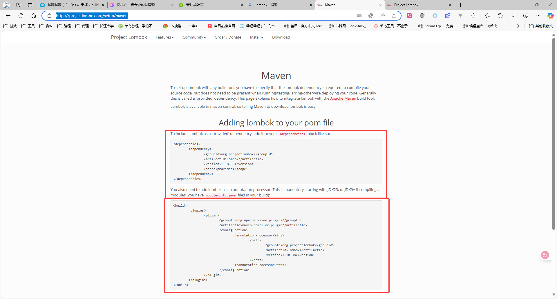 到此我们需要安装Lombok依赖,用于减少样板代码,提高开发效率。 在此我推荐去相关依赖的官网,找到最新版本的依赖导入方式,否则会出现各种奇奇怪怪的报错。 Lombok官网Maven依赖导入: