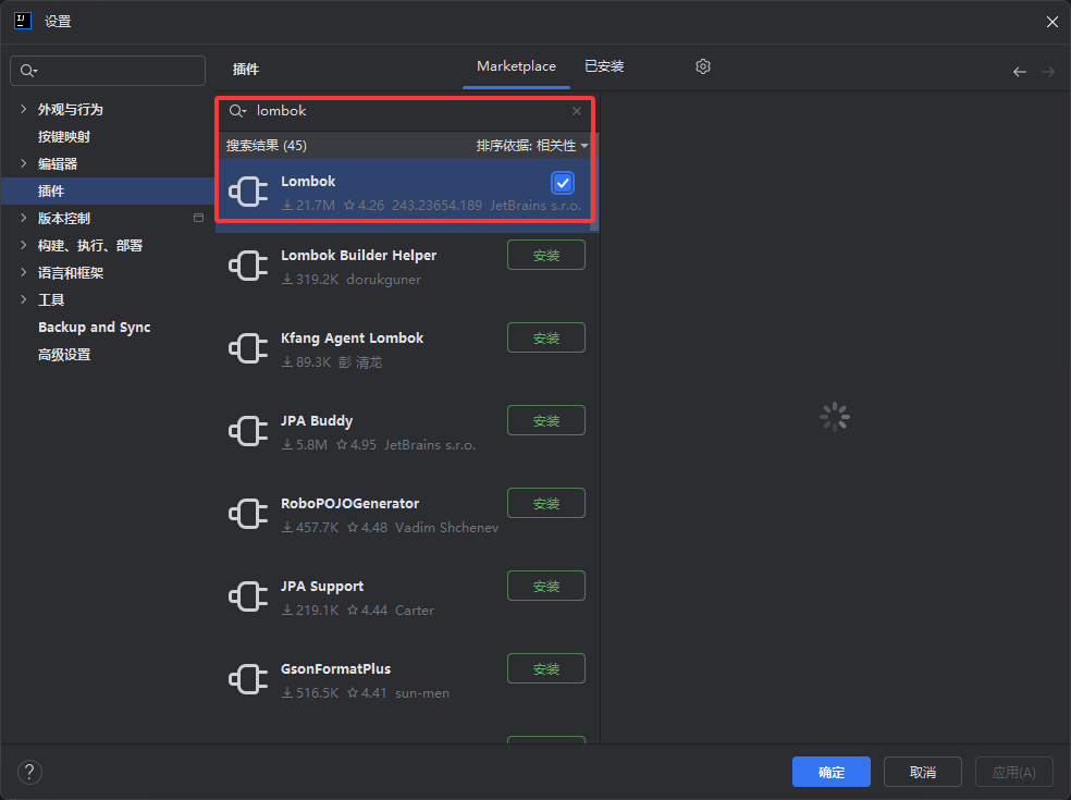 导入依赖后不要忘记同步一下Maven更改 在设置里找到插件并下载lombok插件