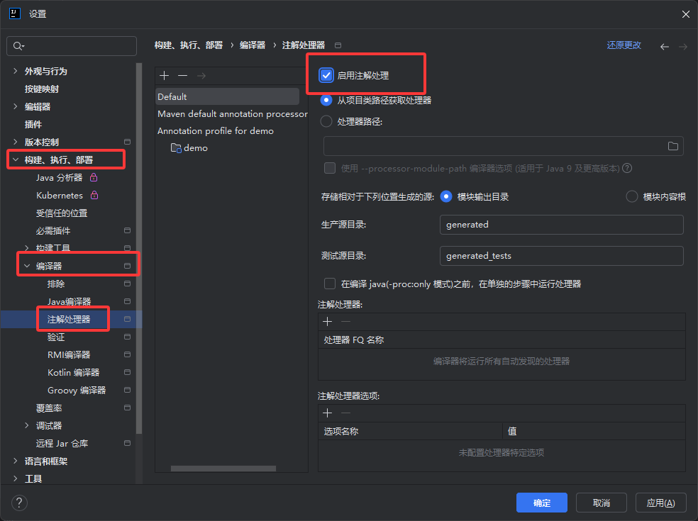 点击构建、执行、部署 -> 编译器 -> 注解处理器 -> 启用注解处理 ->确定