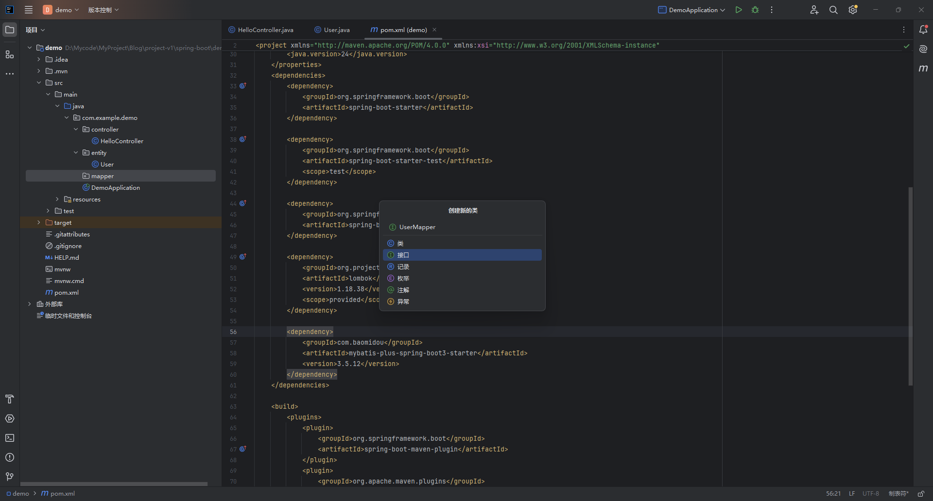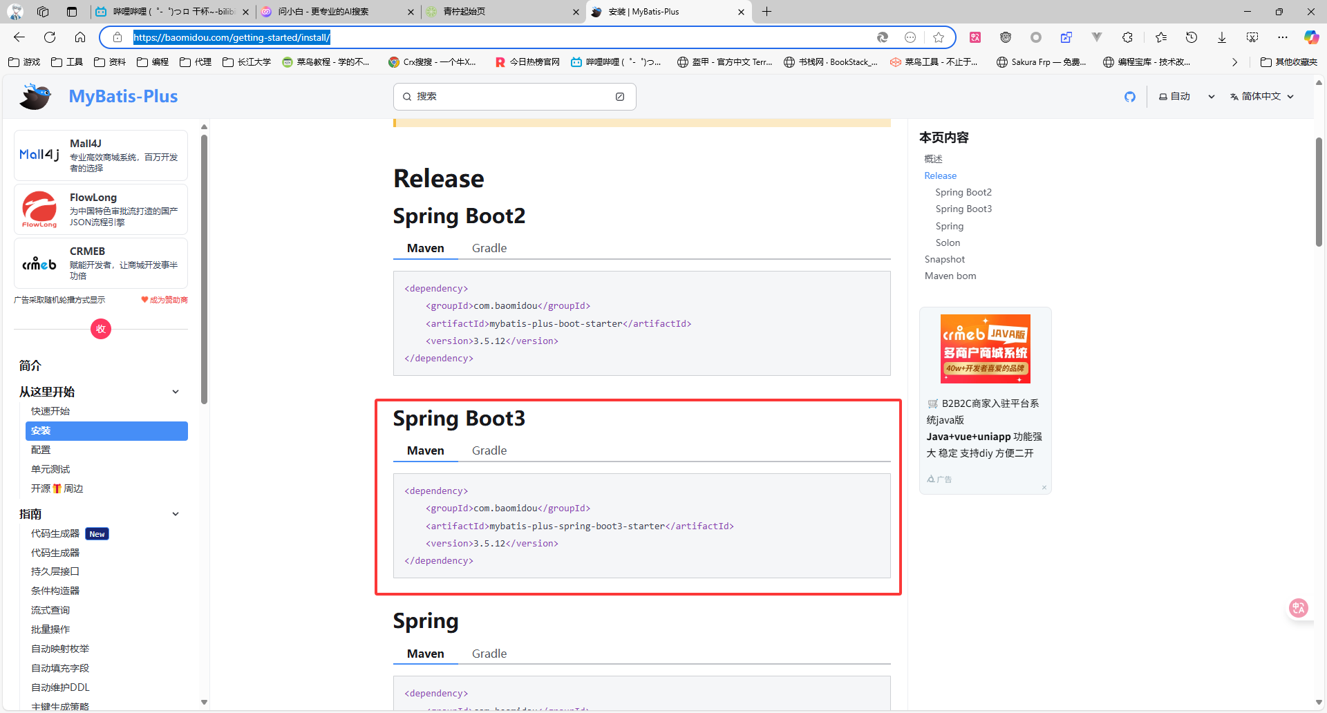 数据库操作这块也有一个依赖可以方便我们提高开发效率 MyBatis-Plus:安装 | MyBatis-Plus 找到Spring Boot3对应的依赖,并添加到pom.xml中,之前已经演示过很多次在此不做赘述。