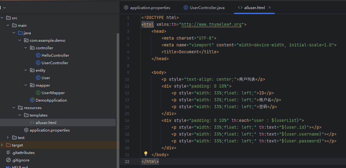 <!DOCTYPE html><html xmlns:th="<http://www.thymeleaf.org>"> <head> <meta charset="UTF-8"> <meta name="viewport" content="width=device-width, initial-scale=1.0"> <title>Document</title> </head> <body> <p style="text-align: center;">用户列表</p> <div style="padding: 0 10%"> <p style="width: 33%;float: left;">ID</p> <p style="width: 33%;float: left;">用户名</p> <p style="width: 33%;float: left;">密码</p> </div> <div style="padding: 0 10%" th:each="user : ${userList}"> <p style="width: 33%;float: left;" th:text="${user.id}"></p> <p style="width: 33%;float: left;" th:text="${user.username}"></p> <p style="width: 33%;float: left;" th:text="${user.password}"></p> </div> </body></html>th:each="user : ${userList}就像Python 里的for user in userList一样,我们可以用 . 符号取出user里的id,username,password等属性。