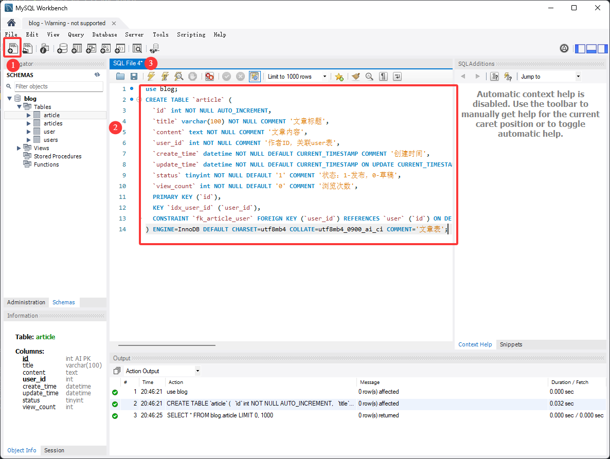 我们需要一个article表,来存放文章内容 点击左上角的创建sql,写入sql代码,最后点击上方的闪电按钮执行。 这里的user_id和用户表的id关联了起来,当用户表的用户被删除时,与之关联的文章也会被一并删除。