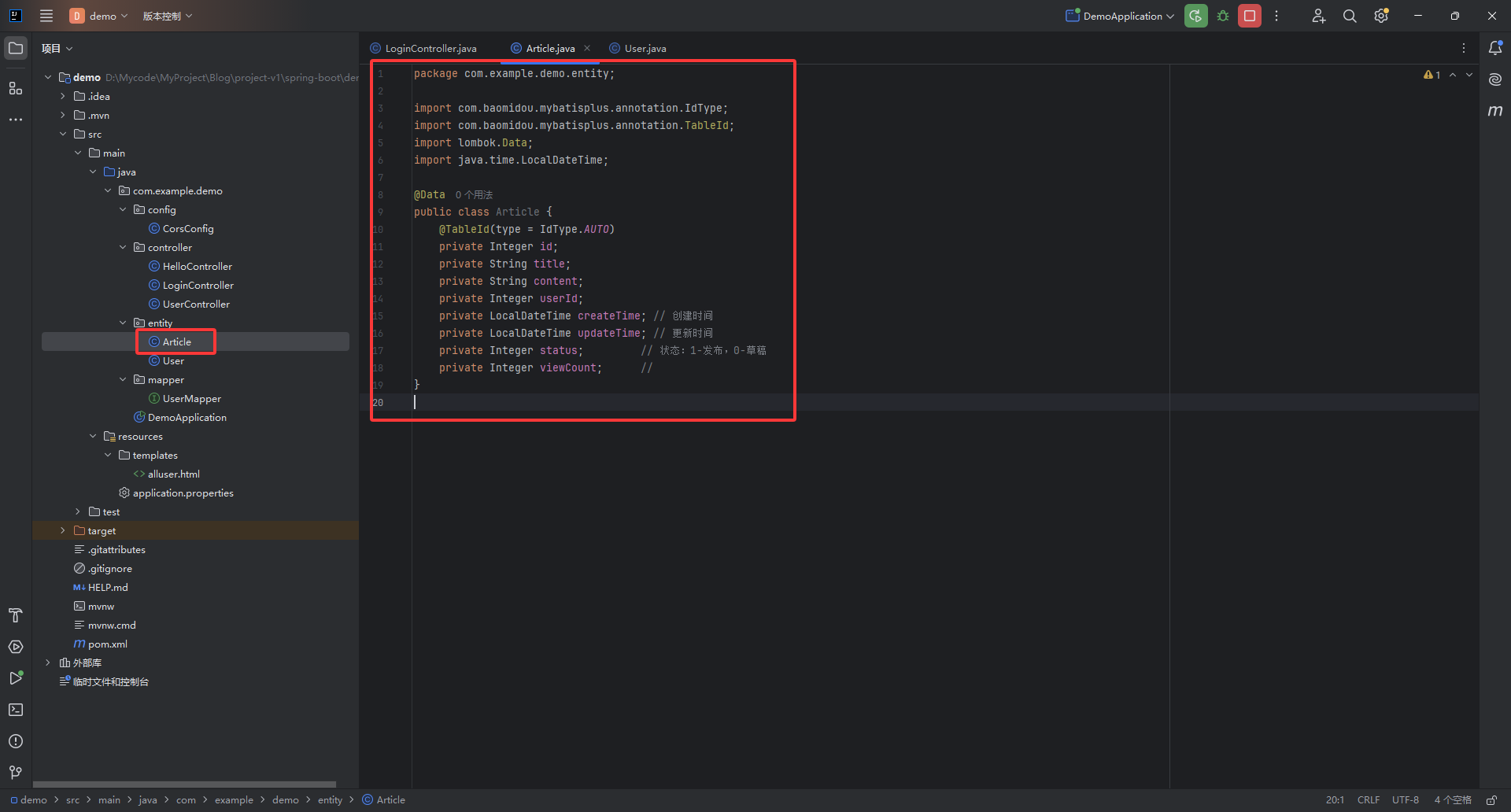 @Datapublic class Article { @TableId(type = IdType.AUTO) private Integer id; private String title; private String content; private Integer userId; private LocalDateTime createTime; // 创建时间 private LocalDateTime updateTime; // 更新时间 private Integer status; // 状态:1-发布,0-草稿 private Integer viewCount; //}ArticleMapper 接口