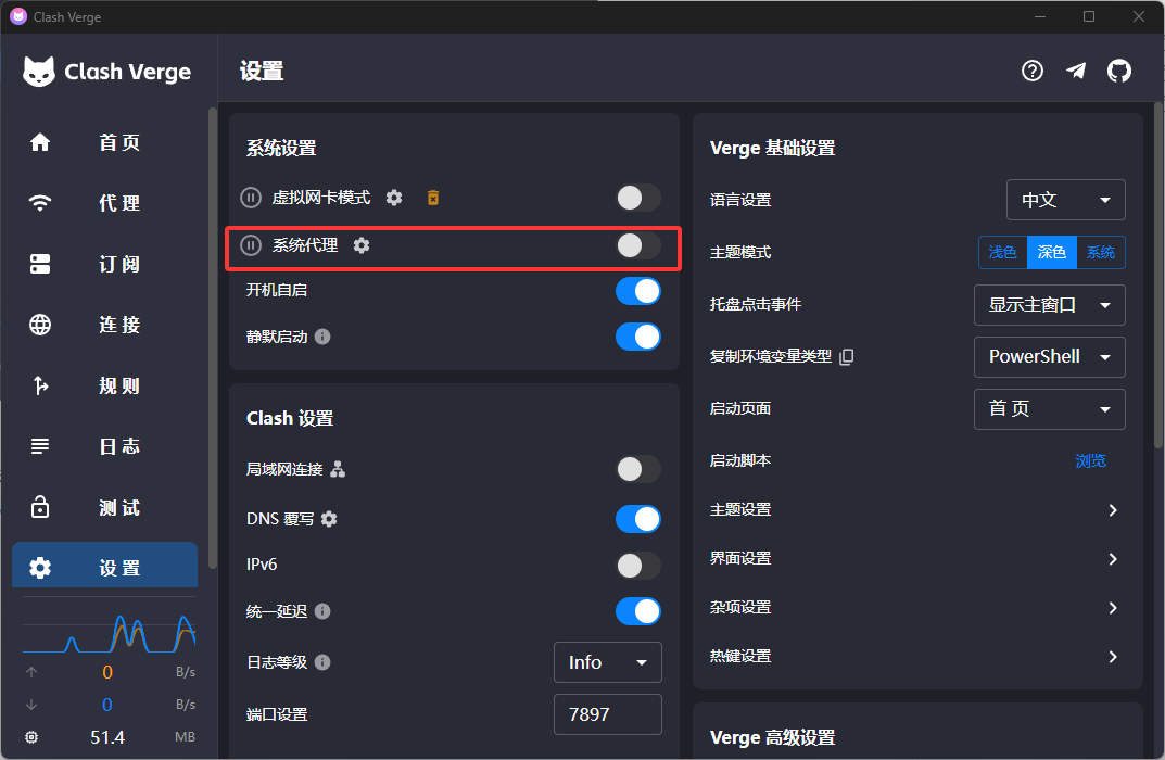 当然上面还有一个虚拟网卡模式,意思就是所有流量都通过代理,包括国内的,通常情况下关闭。Clash会自动将你的流量分流,国内的网站就直连,国外的网站使用代理。
