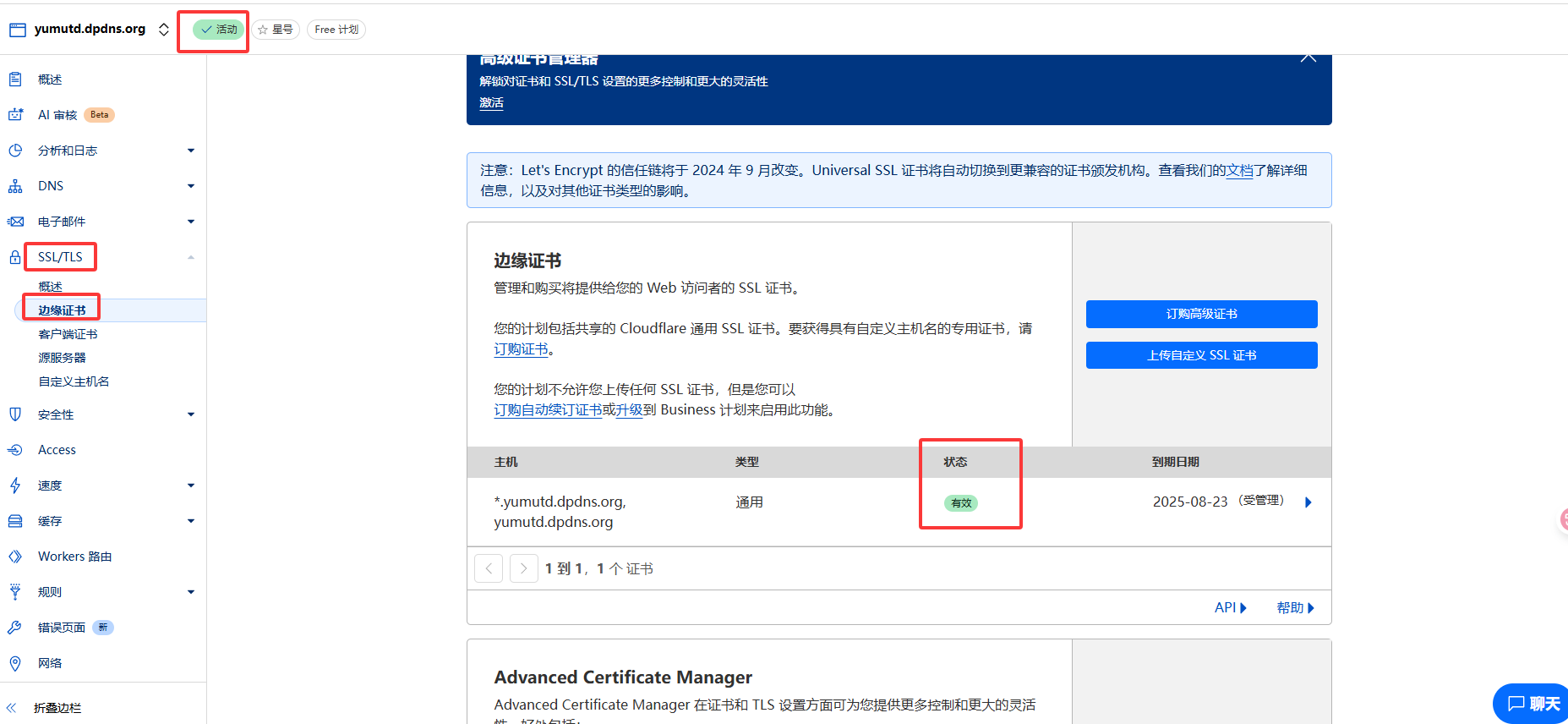 我们回到cloudflare,等一会后刷新,可以看到我们的域名处于活动状态,打开边缘证书,可以看到是有效状态,我们成功将自己的域名托管到了cloudflare,并且还给了我们的域名一个免费的https加密