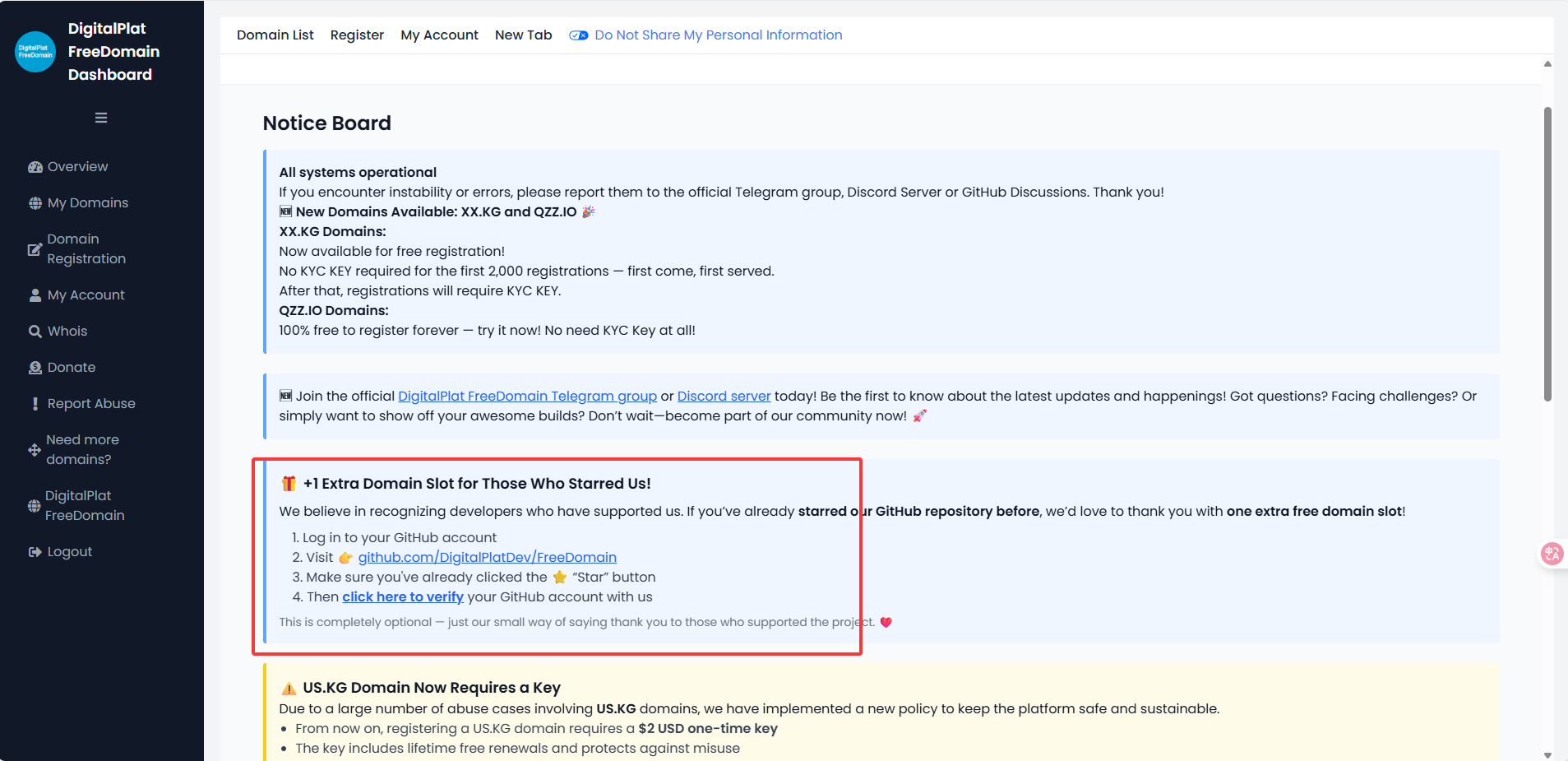 通过验证后来到主页,你可以给官方的git仓库点个小星星,验证后会额外赠送你一个域名名额