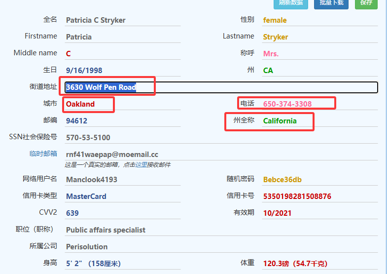 我们打开随机生成美国人名信息网站 美国身份证生成,美国人地址信息生成-世界各国身份信息、地址、信用卡生成器